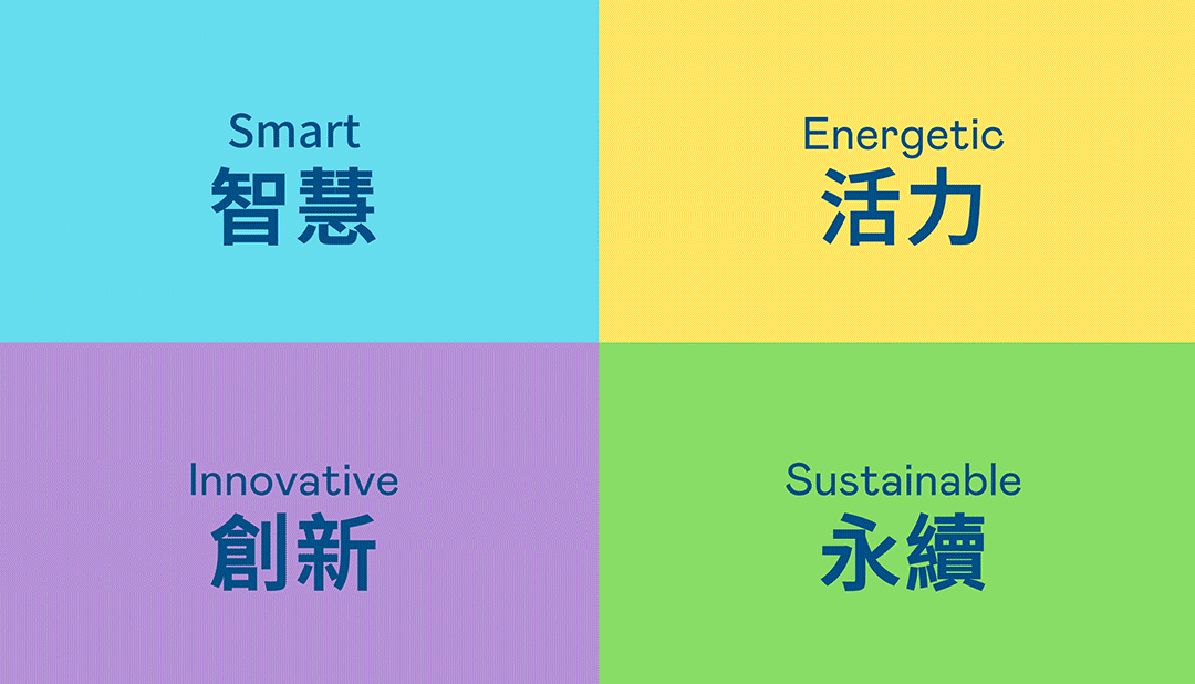 從穩重、信賴的大庄家藍開創新色彩,注入象徵智慧藍、活力黃、創新紫、永續綠的品牌色及動態多變的幾何圖形,呼應不設限的「Possibilities」精神,代表多元的專業技術及領域,在碰撞中相互觸動、融合、延伸,持續激盪出更多新的可能性。